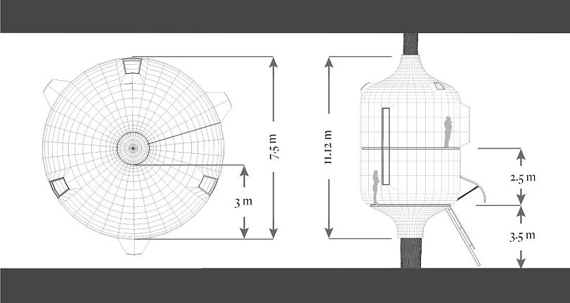 由上圖可以簡單看出,樹屋是兩層建築,每間可以容納四個人。安東尼表示,依照建造樹屋所處不同的地形特性,窗戶數量和樣子也可以變換,其中窗戶的設計樣貌有三種可供選擇。而連接上下樓的梯子是螺旋設計,為的是減少空間的浪費。若是沒有樹木可以依附,胚胎事實上也可以獨立建築在平地上。